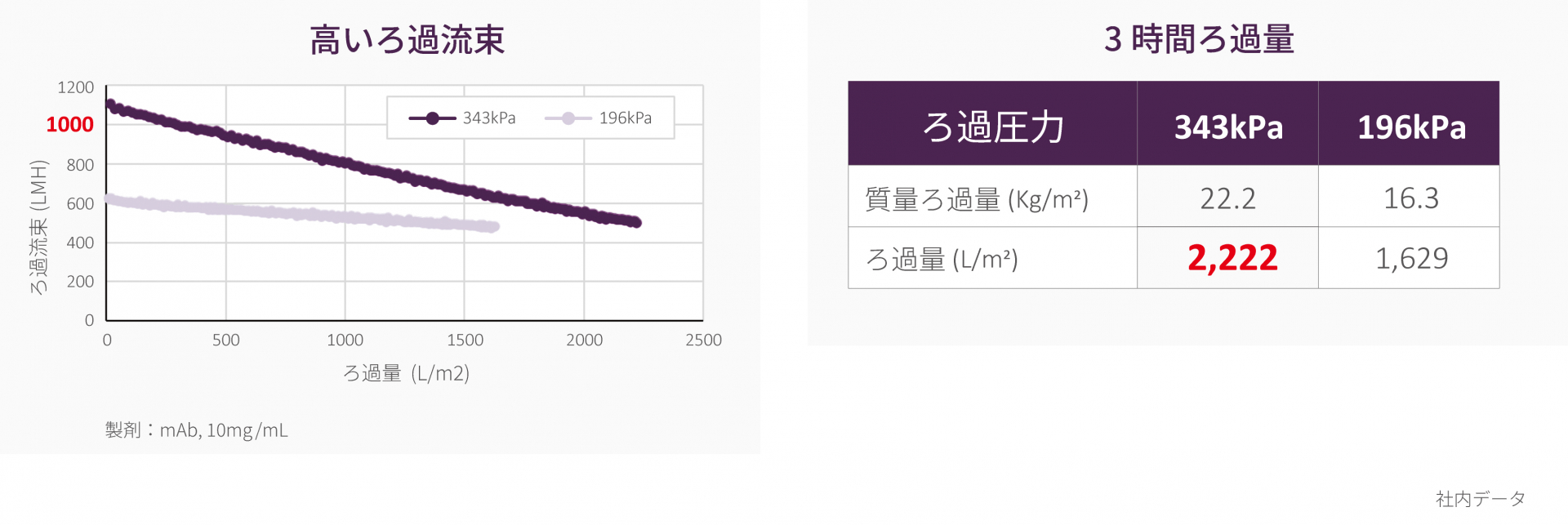 プラノバFG1は、ろ過圧力343 kPaで1,000 LMH以上の初期ろ過流束を示しました。