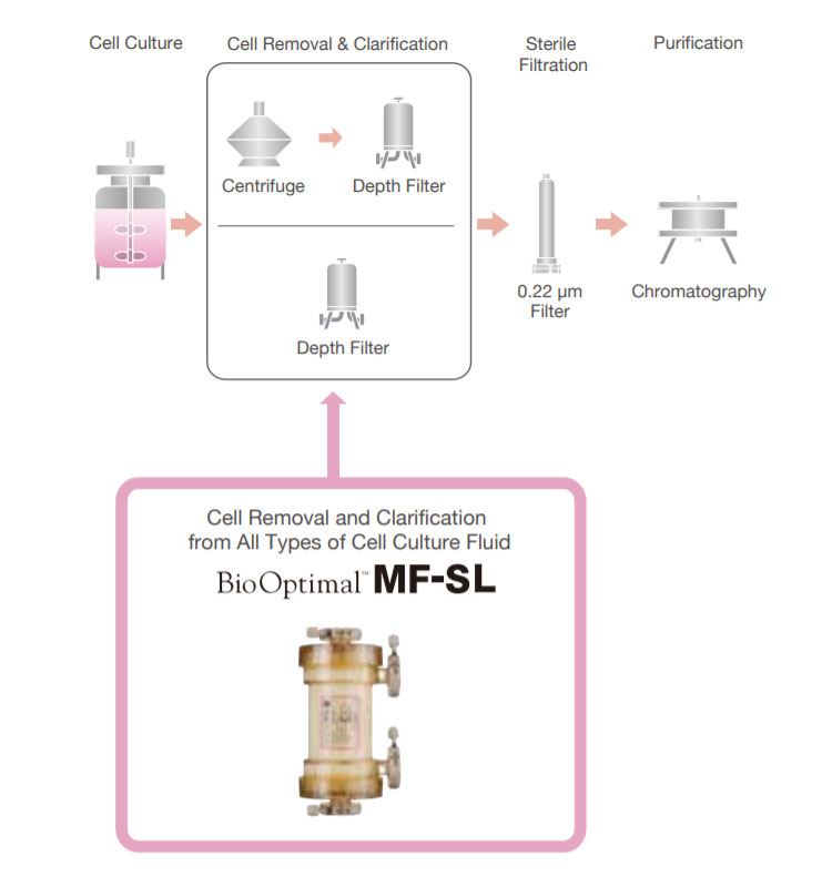 BioOptimal MF-SL is able to clarify solutions quickly and completely in a single processing step. Therefore, it simplifies the cell culture clarification process and makes it more cost-effective by eliminating the needs for large investments like centrifuges and expensive disposable items like other depth filters.Features