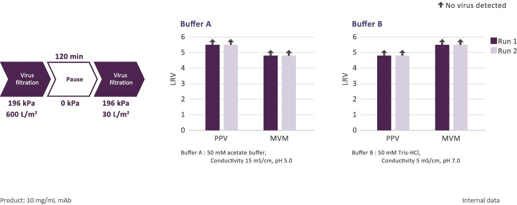 Planova FG1 can consistently achieve high virus removal capability, even during extended process pauses. Furthermore, complete clearance can be achieved even with a 120 minutes process pause.